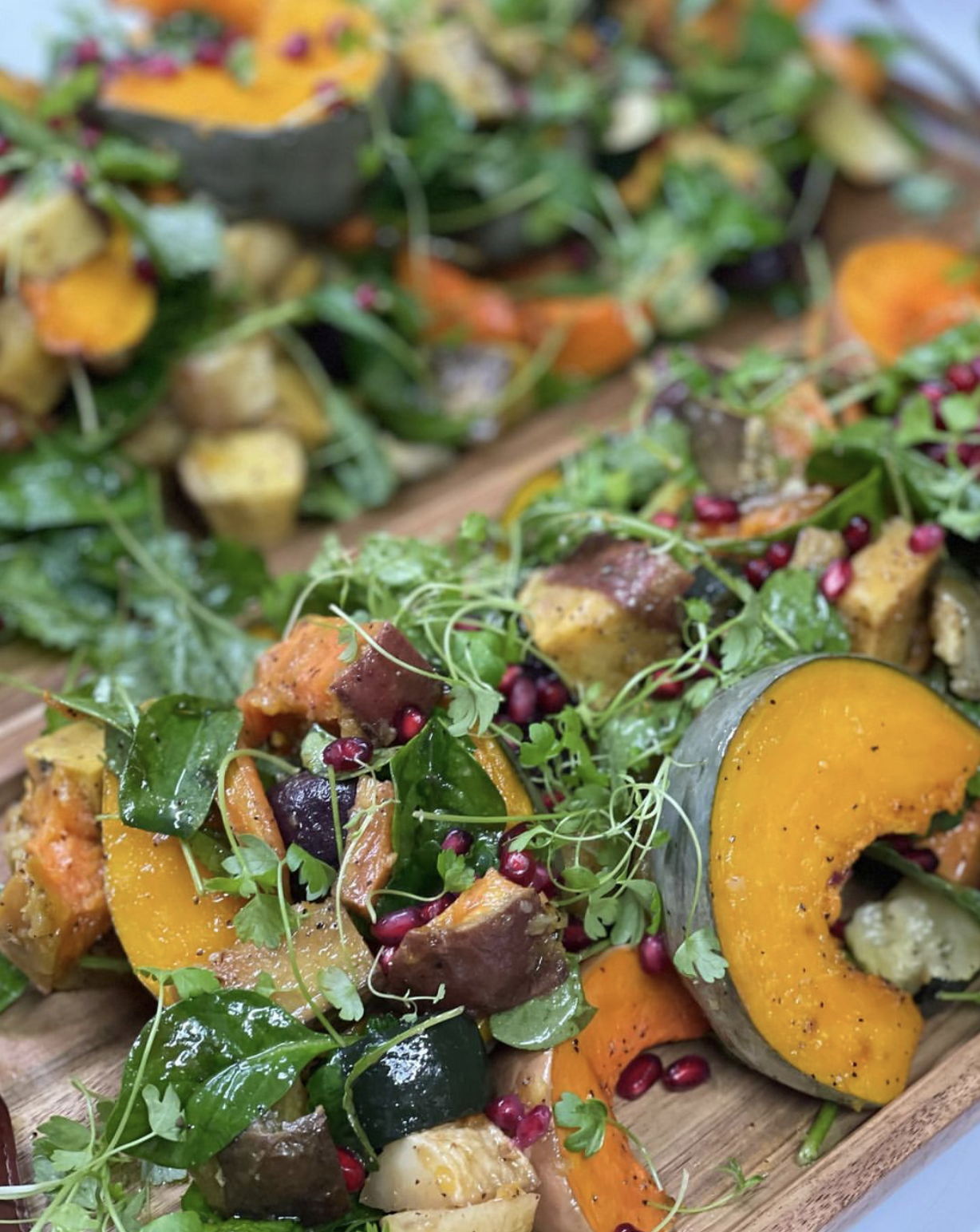 Warm Israeli Couscous Salad filled with seasonal roasted vegetables, baby spinach, and feta, topped with pomegranate arils